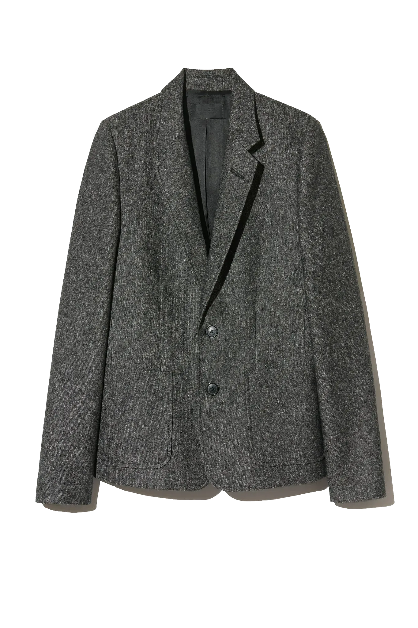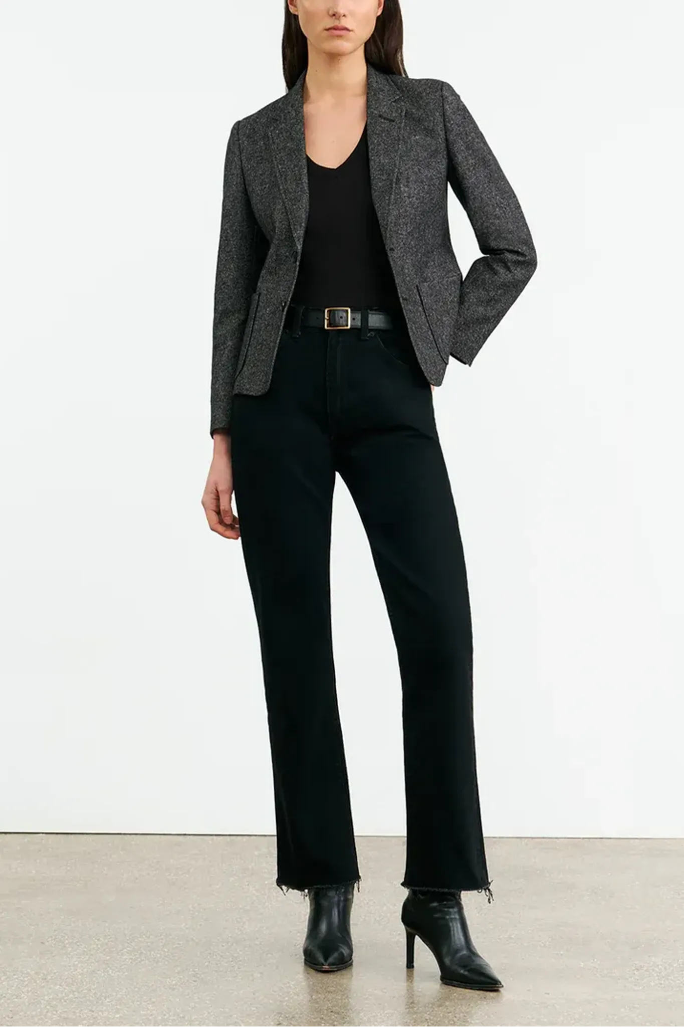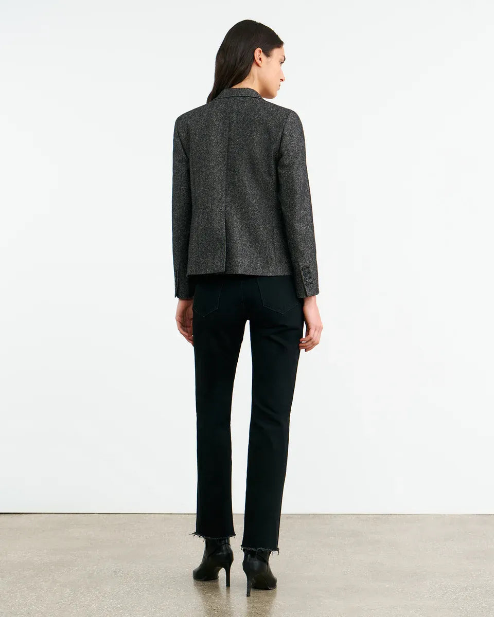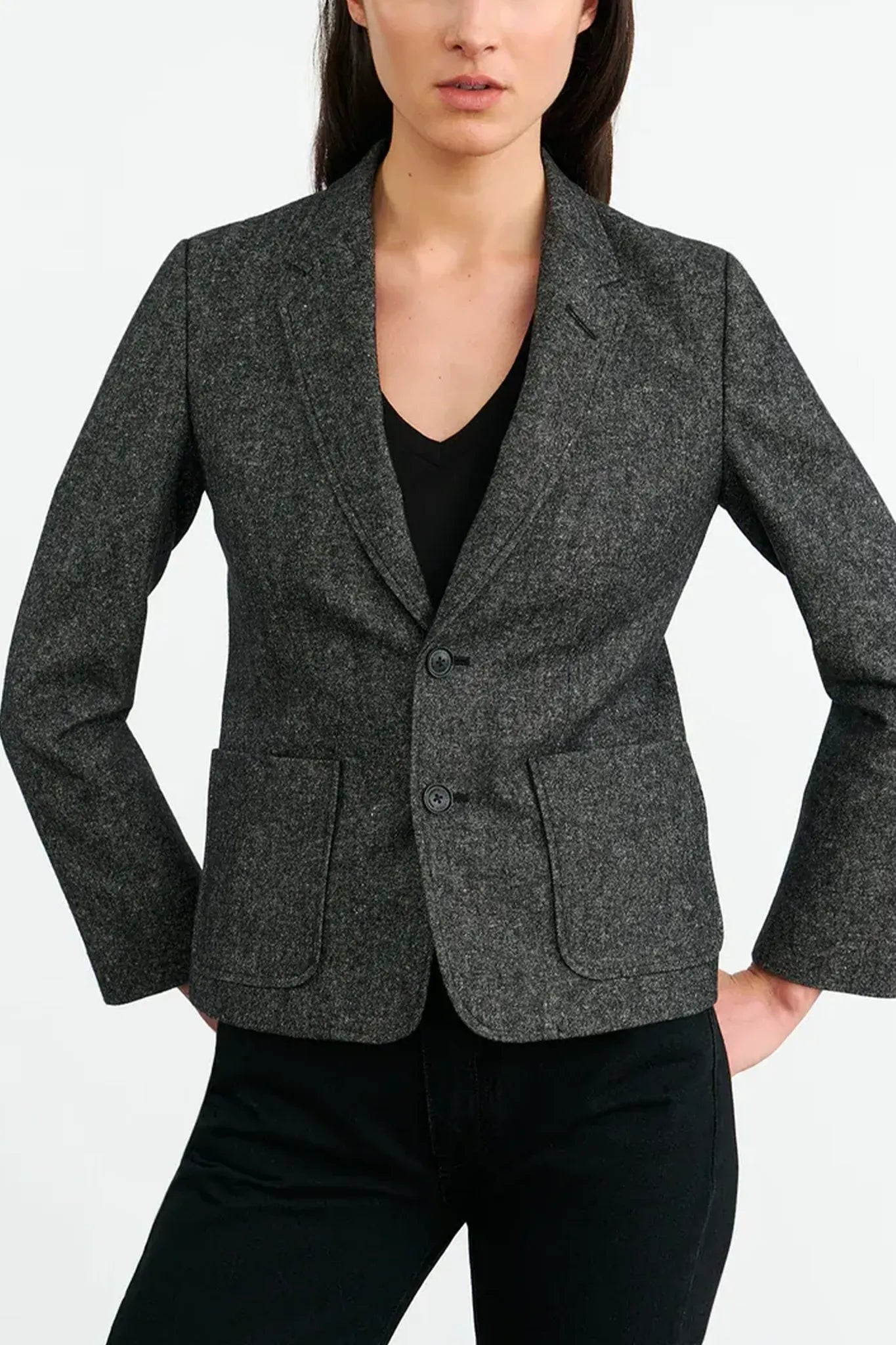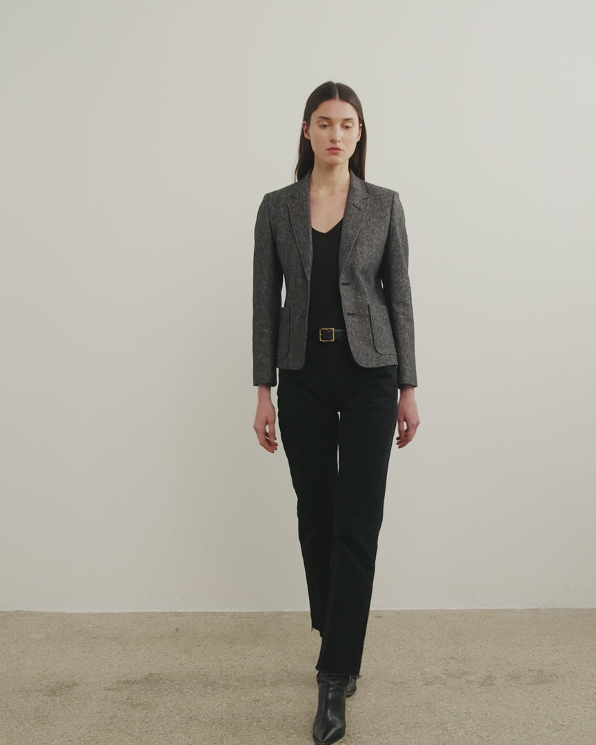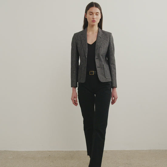Der Holden Blazer überzeugt mit schlanker, verkürzter Silhouette. Er endet auf Hüfthöhe, zeigt ein tiefes Revers mit Keyhole-Ausschnitt und erhält Struktur durch Schulterpolster und Abnäher. Patch-Pockets und ein Rückenschlitz runden das Design ab – ein modernes Tailoring-Piece.