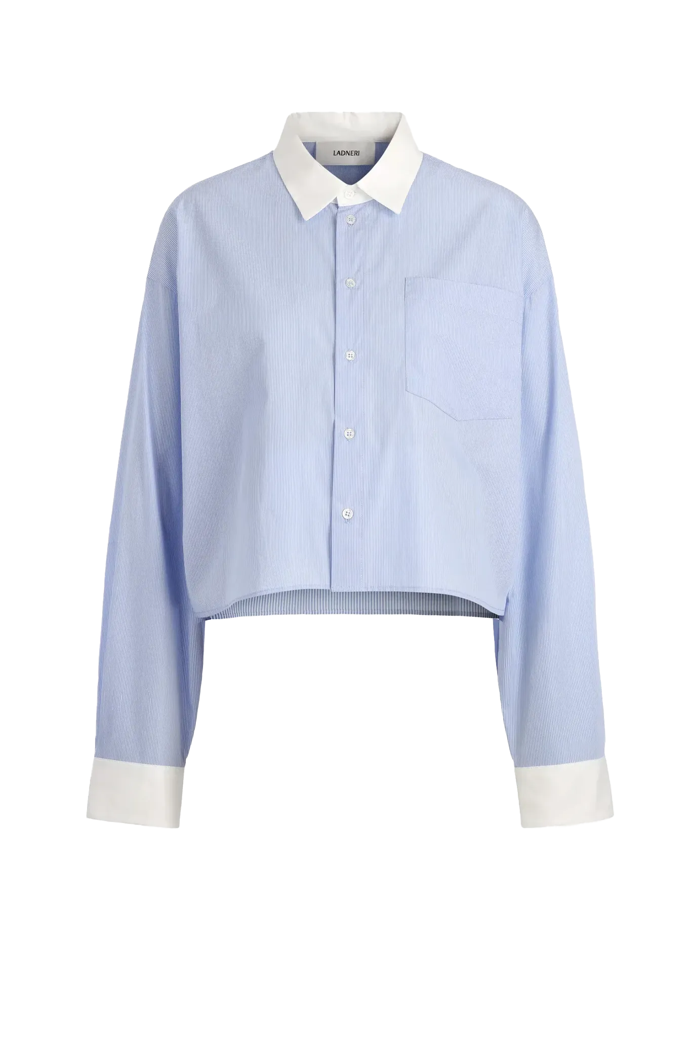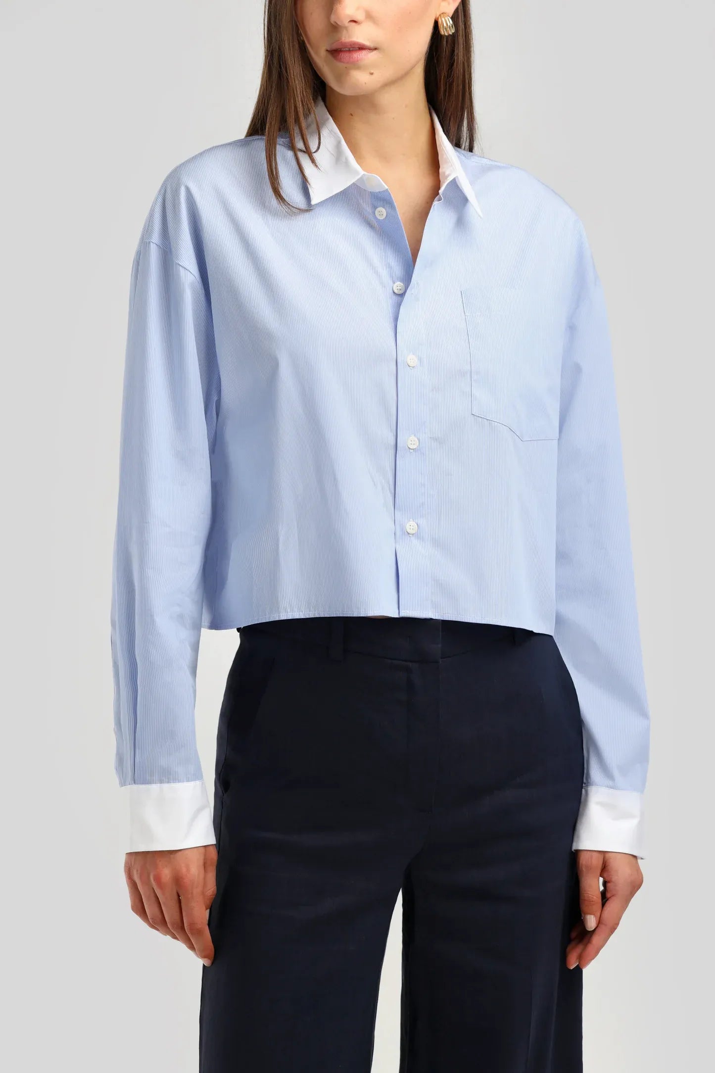 Verkürztes Hemd mit Kontrastkragen und -manschetten, Brusttasche und durchgehender Knopfleiste. Aus feinem Baumwollgewebe mit dezenten Streifen.