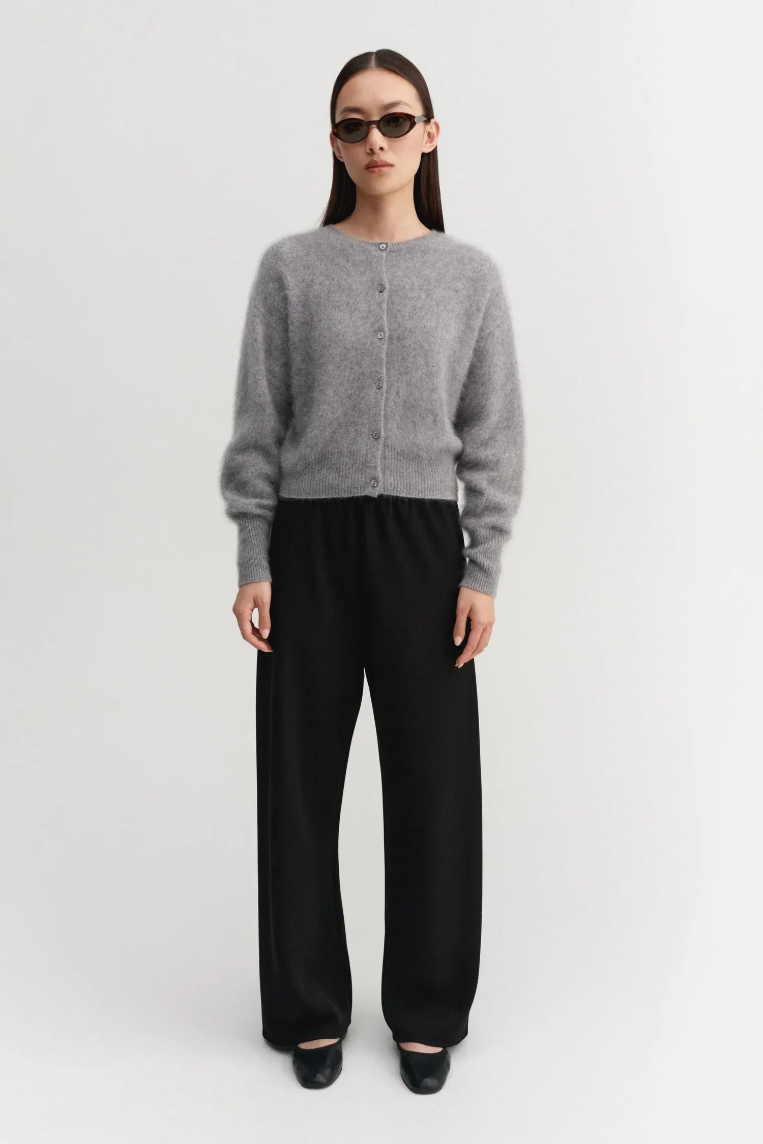 Luxuriöse Strickjacke aus gebürstetem Bio-Kaschmir mit weichem Griff. Leicht lockere Silhouette mit schmalerer Taille, klassischer Rundhalsausschnitt und überschnittene Schultern. Vorn farbige Kaschmirknöpfe, Rippstrick an Ärmeln und Saum.