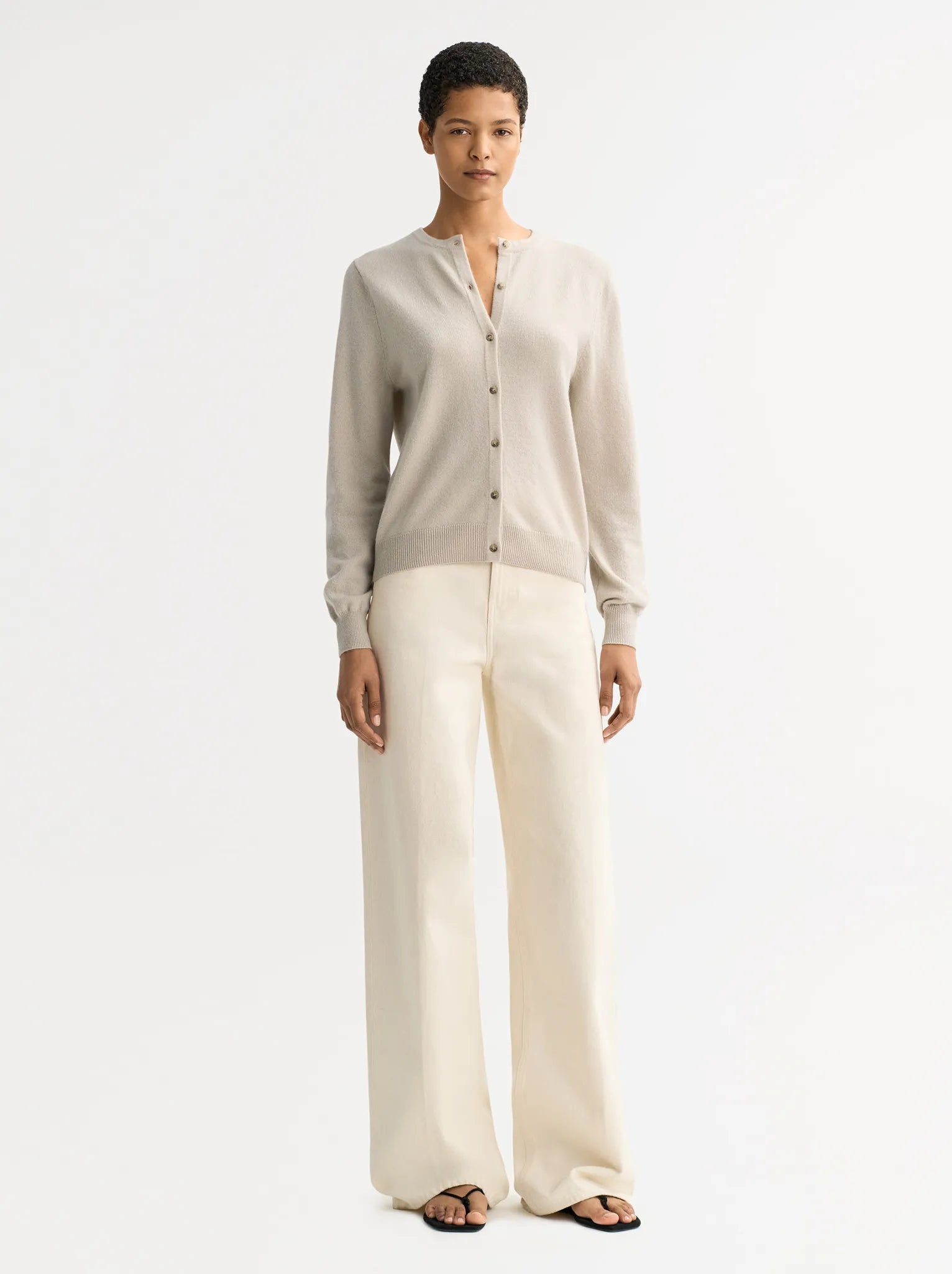 Feiner Cashmere-Cardigan in hellem Chalk-Ton mit schmaler Passform. Die klare Knopfleiste und der Rundhalsausschnitt unterstreichen den reduzierten Look.