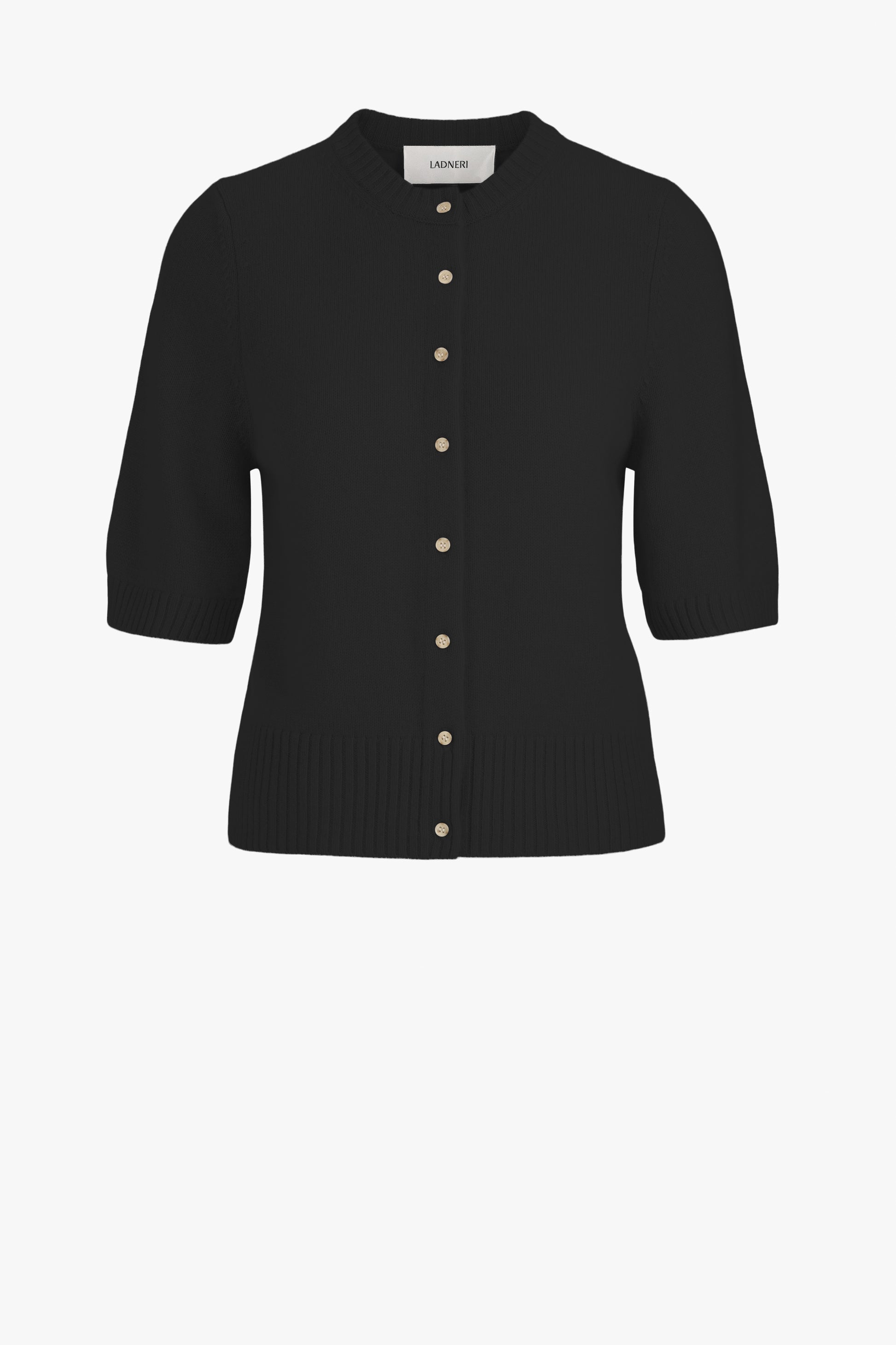 Feine Strickjacke mit Rundhalsausschnitt und kurzer Knopfleiste. Gerader Schnitt, kurze Ärmel, gerippte Abschlüsse. Aus reinem Kaschmir – weich und edel.
