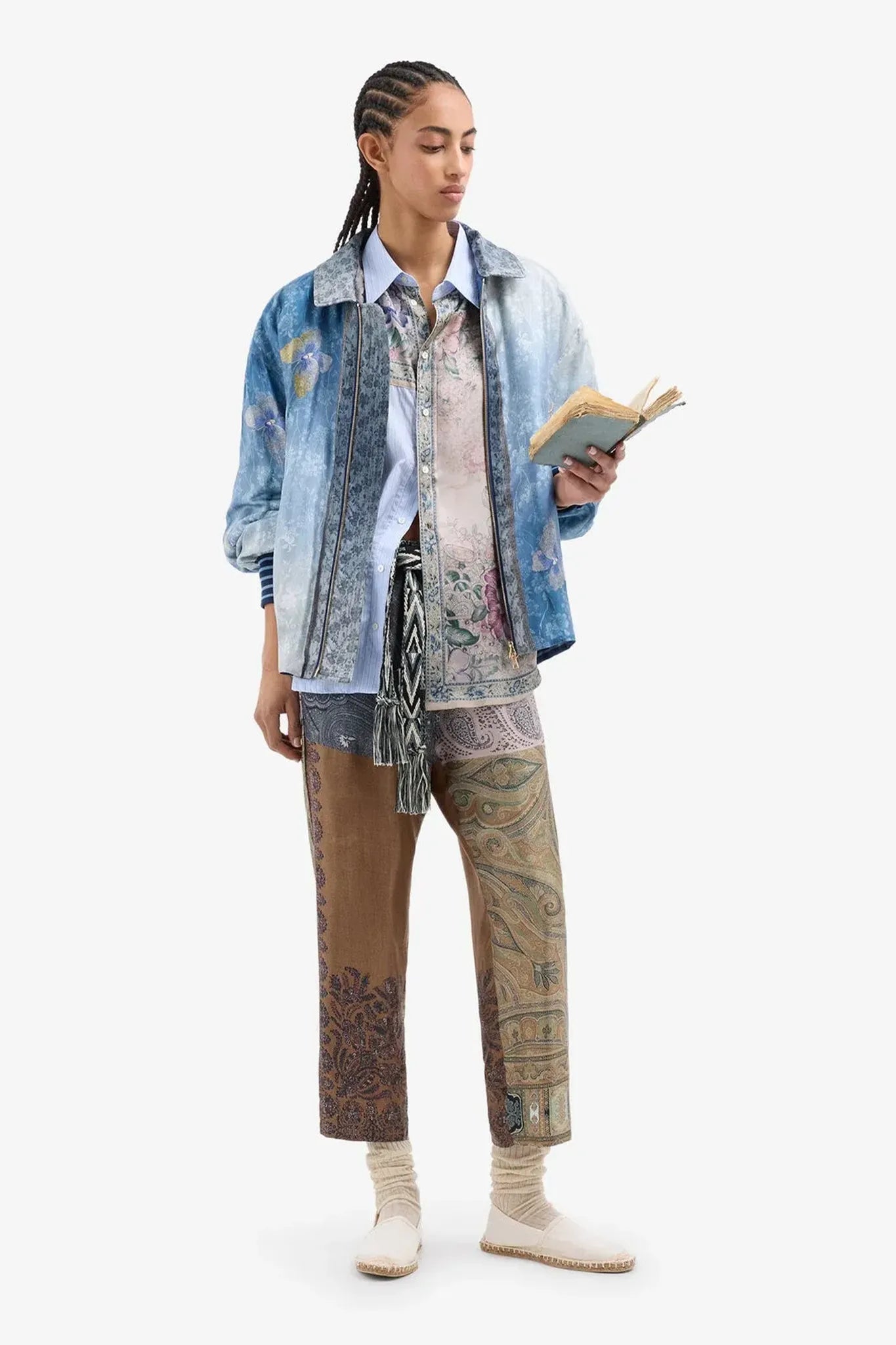 Seidenhose mit geradem Bein und elastischem Bund. Unterschiedliche Musterflächen in ruhiger Kaki-Farbwelt – ein Statement-Piece für moderne Stylings.