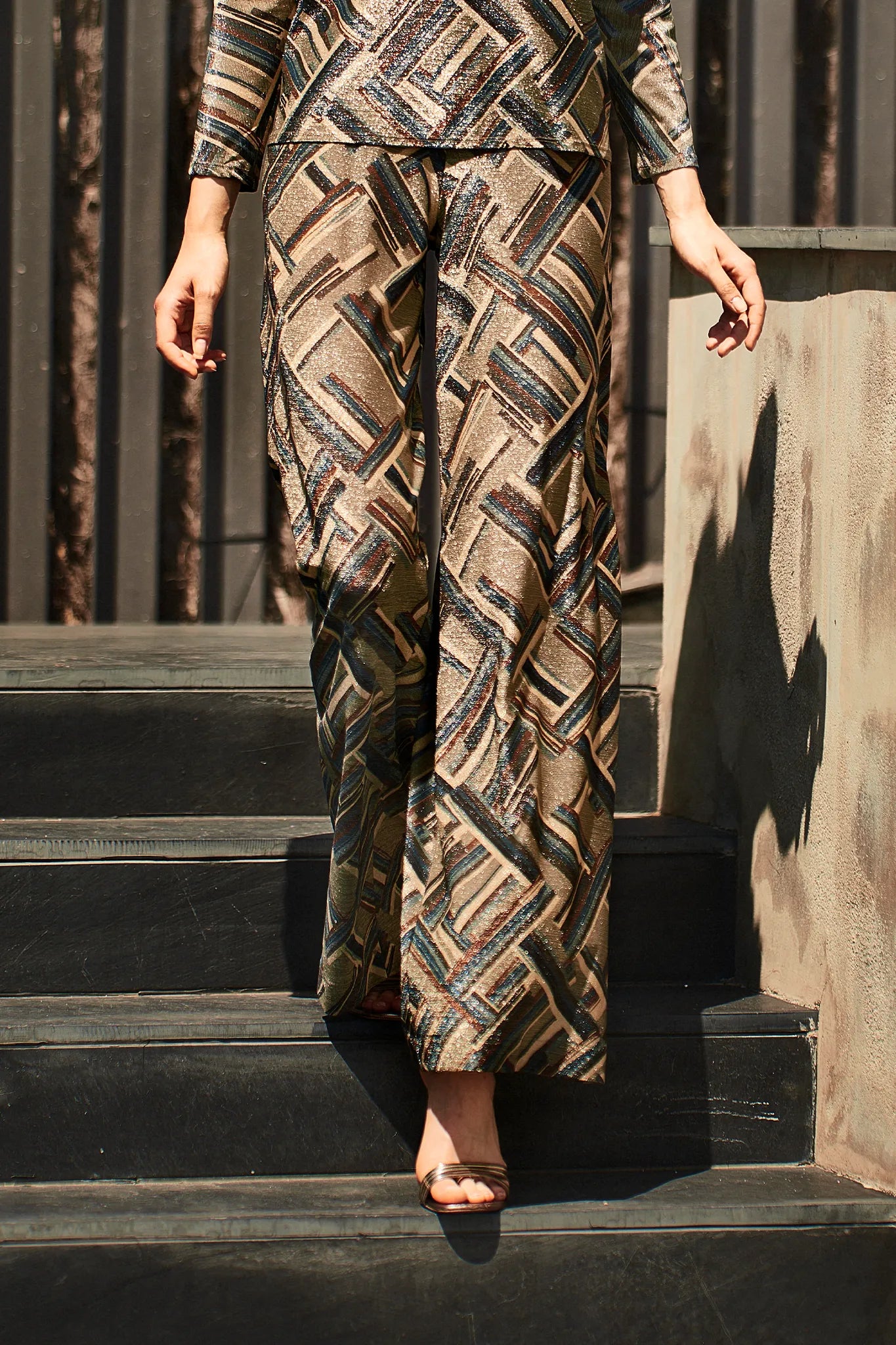 Das Top Arvo zeigt einen weich fallenden Schnitt mit V-Ausschnitt und einem ruhigen, grafischen Muster in goldenen Nuancen. Das Material trägt sich leicht und hat eine angenehme Haptik. Ein cleanes Design ohne Verschlüsse – modern, reduziert und ideal abgestimmt auf die passende Arvo Hose. Made in Spain.