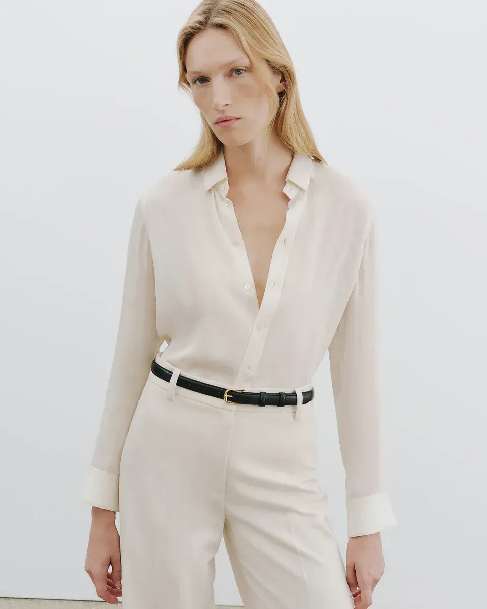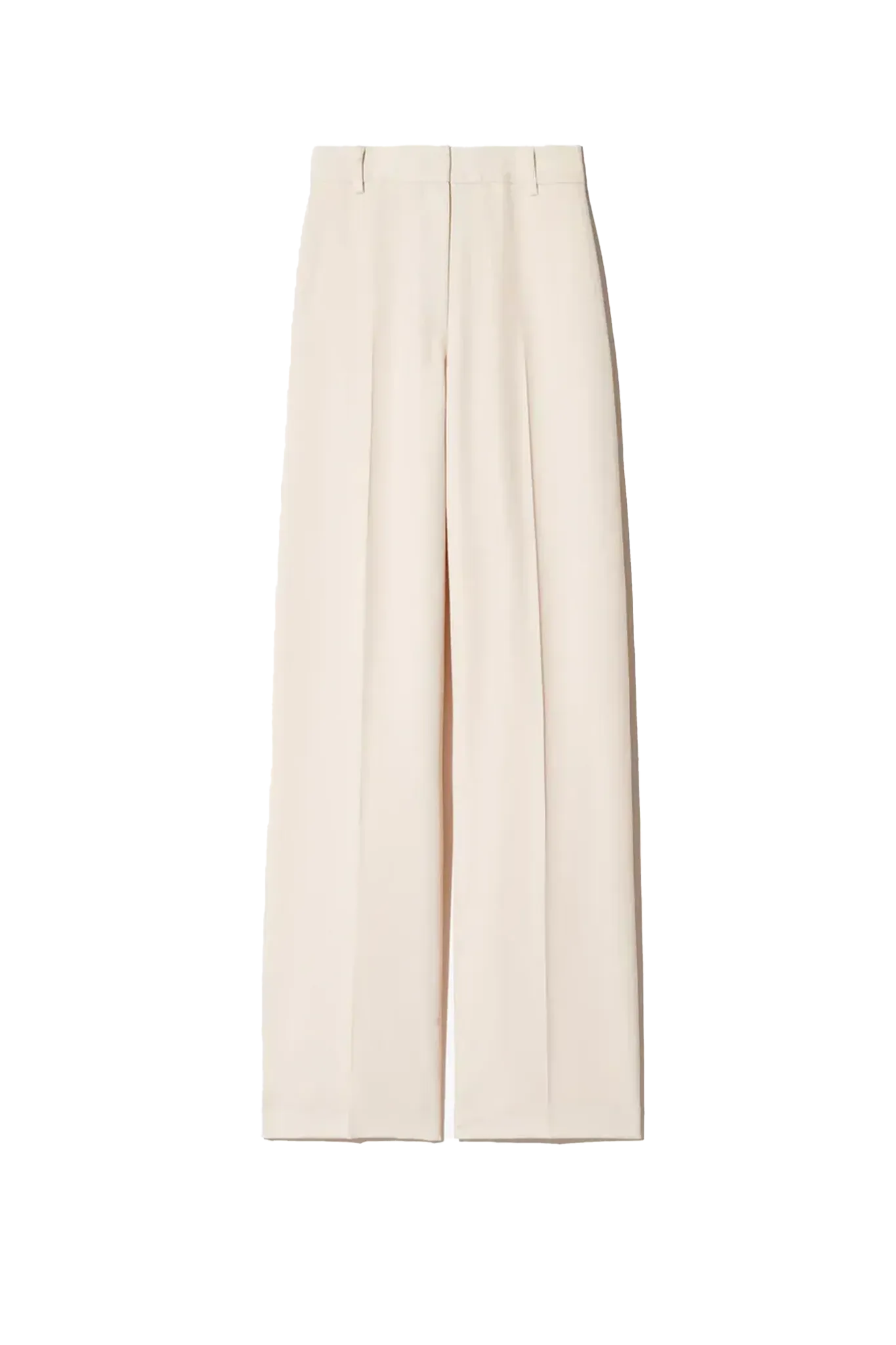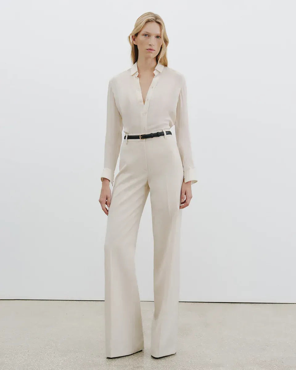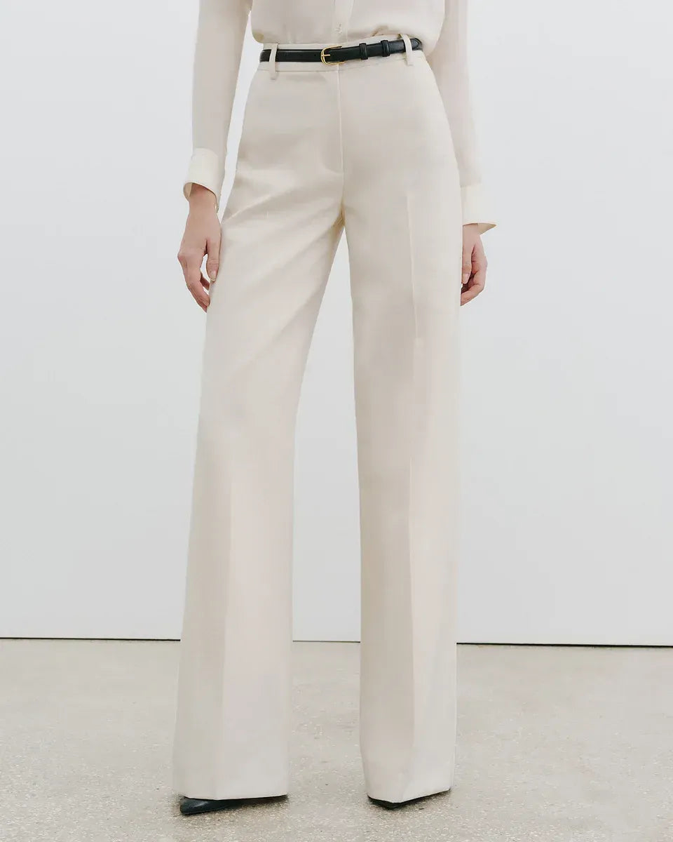 Hoch geschnittene Hose aus reiner Schurwolle. Entspannter Sitz an Hüfte und Oberschenkel. Die cleane Verarbeitung der Hose unterstreicht die fließende Silhouette.
