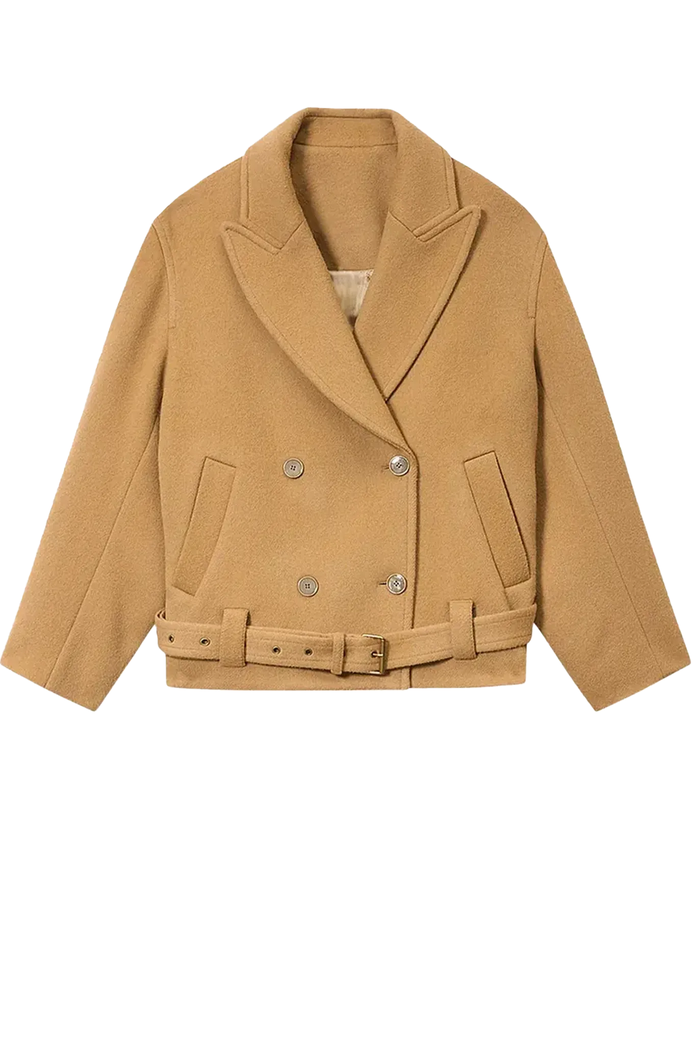 Kurz geschnittene Woll-Kaschmir Jacke mit Gürtel, Reverskragen und zweireihigem Knopfverschluss.