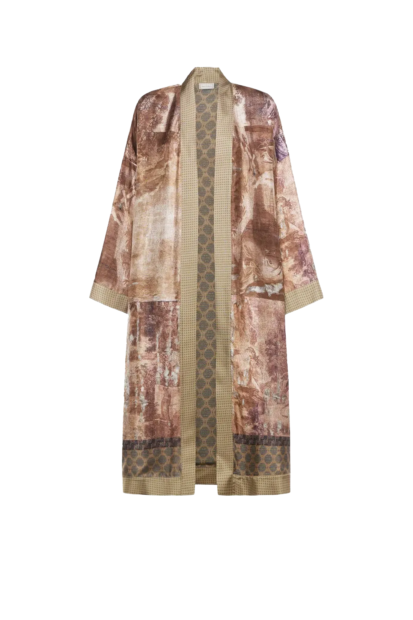 Langer Kimono mit offener, gerader Silhouette und ruhigem Fall. Mehrschichtiger Print in Rosa Antico und warmen Naturtönen – ein vielseitiges Layering-Piece.