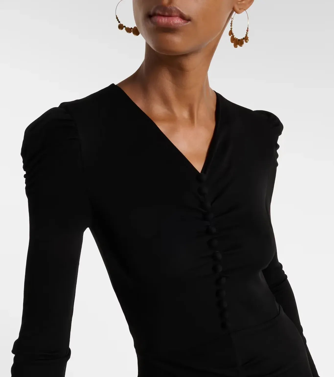 Tailliertes Midikleid mit Raffungen, strukturierten Schultern und asymmetrischem Saum.