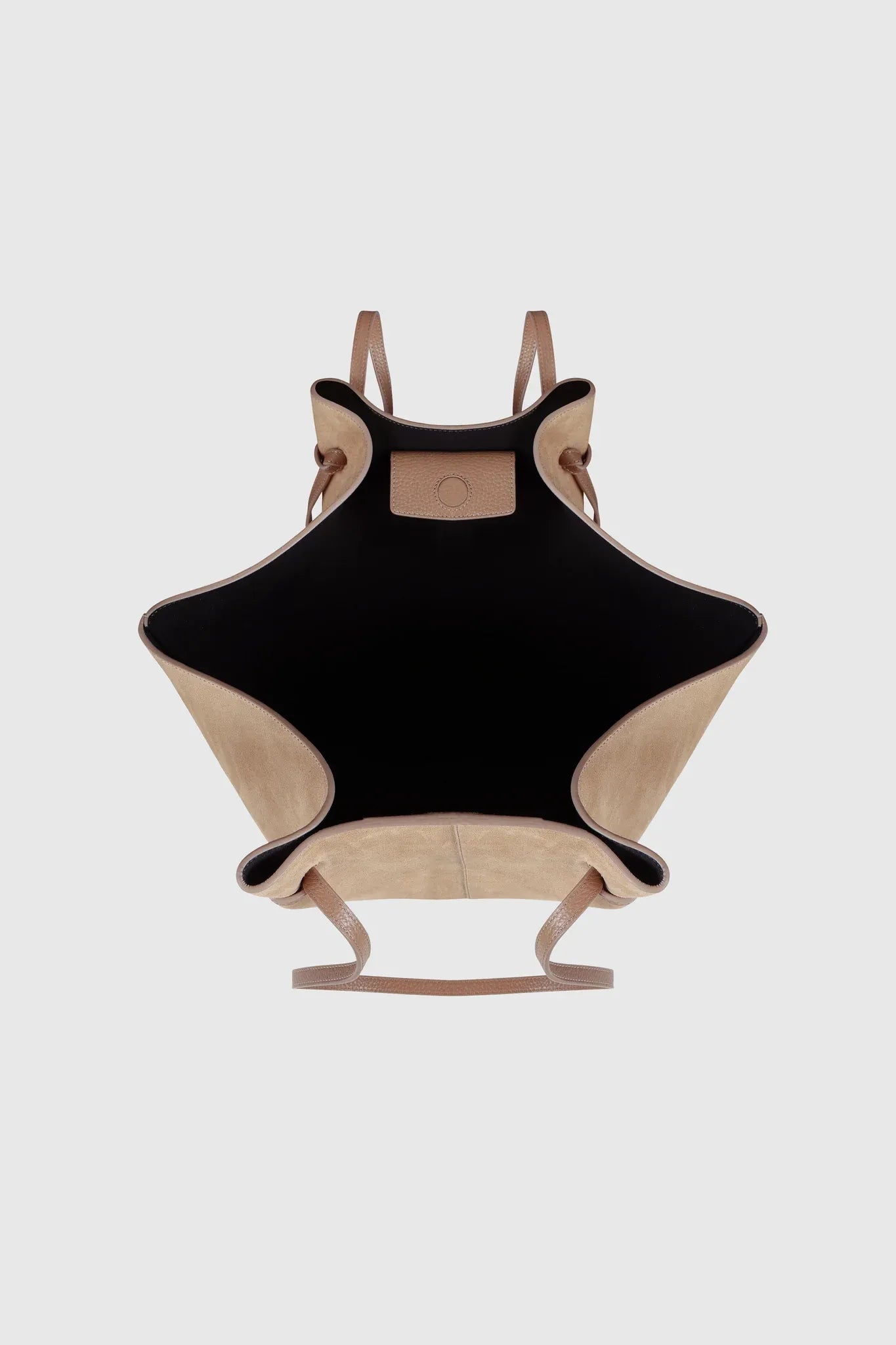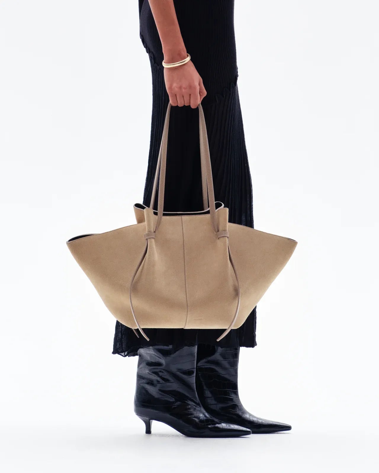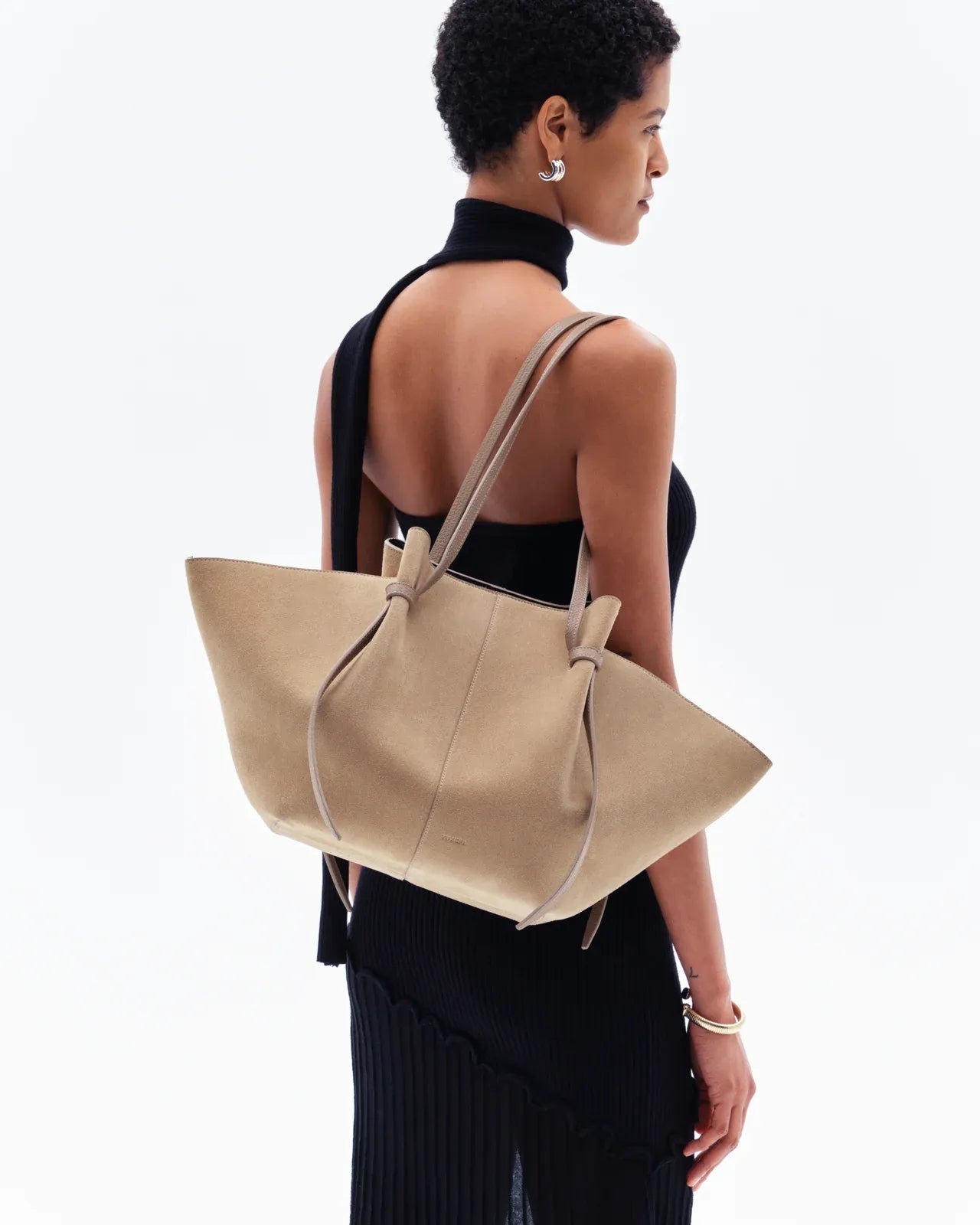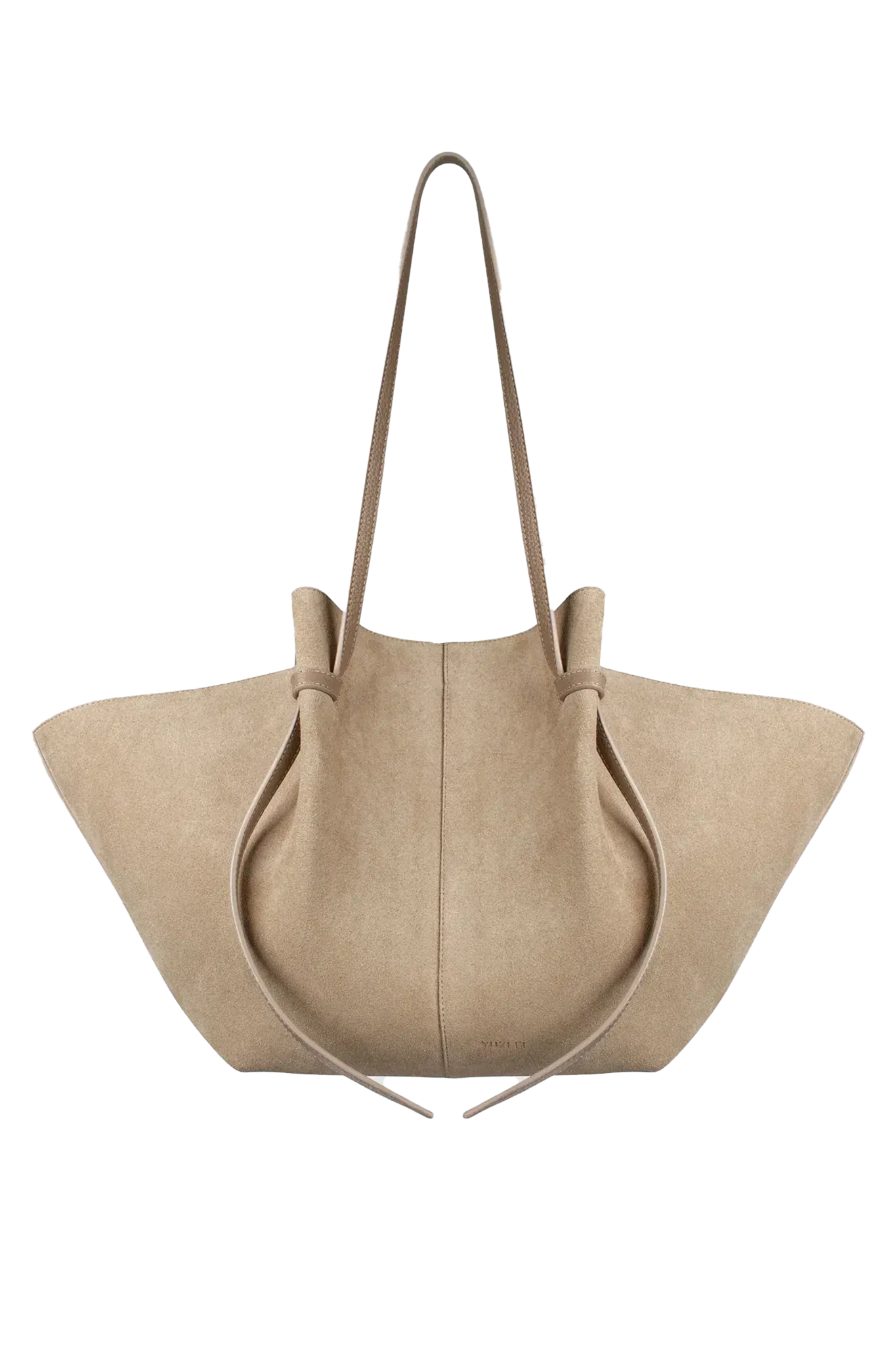 Die Large Mochi von Yuzefi ist eine handgefertigte Tote aus weichem Wildleder in Sand. Ihre fließende Silhouette und das Knotendetail verleihen ihr eine moderne Note. Mit Magnetverschluss und verstellbarem Riemen. Handgefertigt in Spanien.