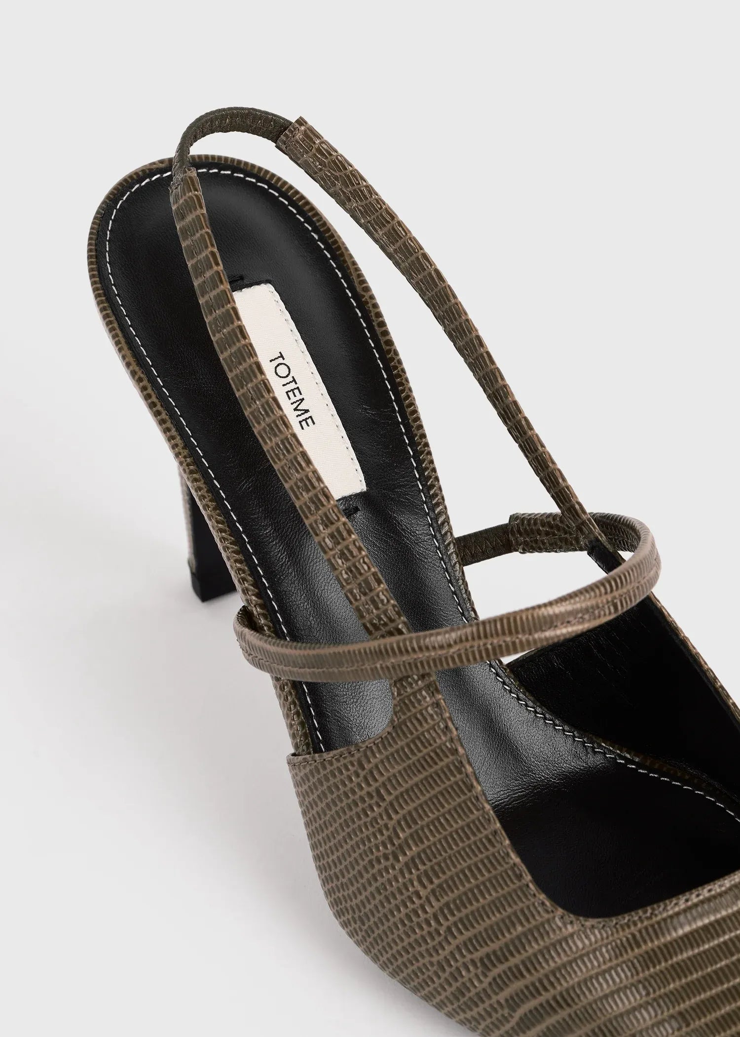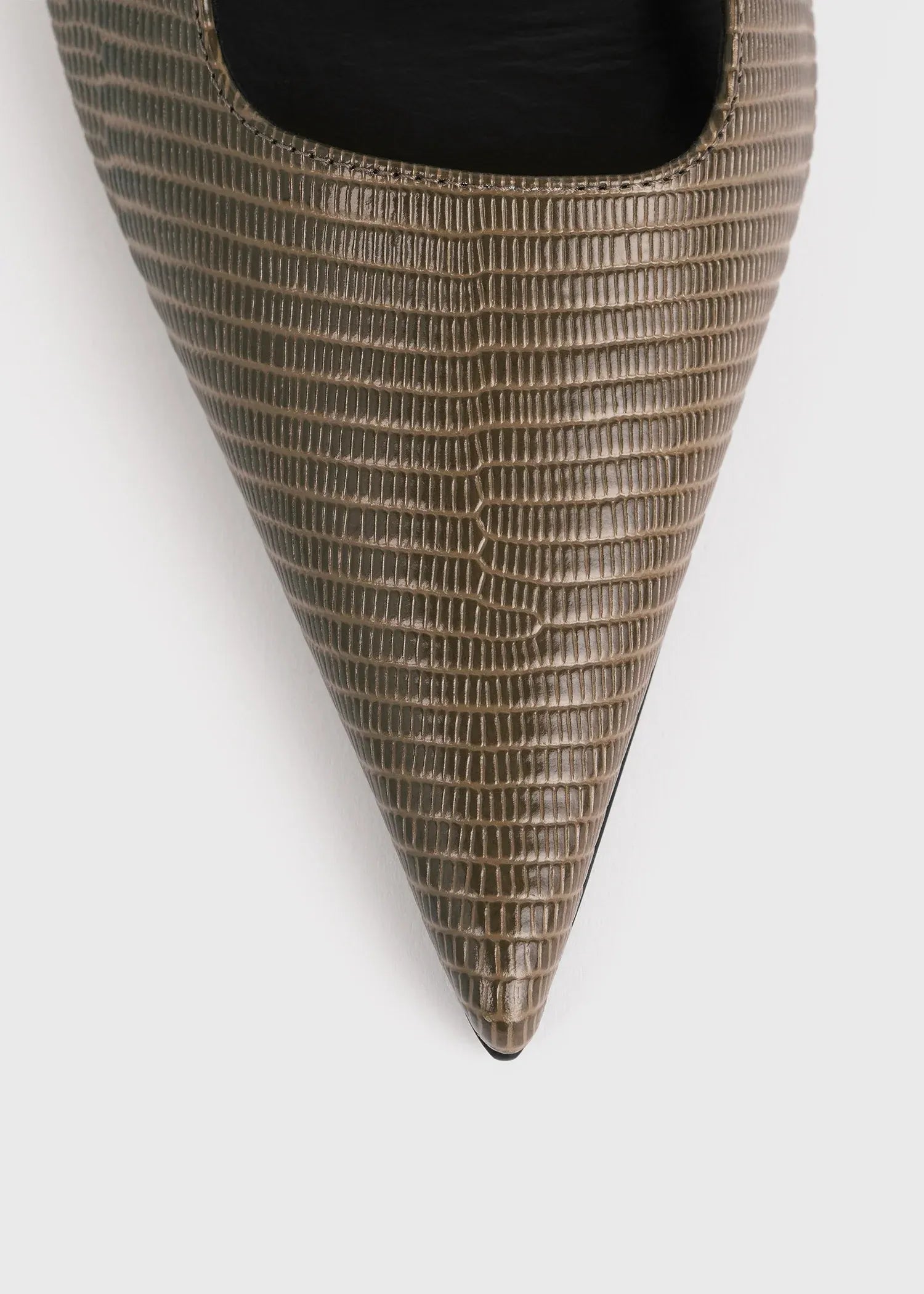 Slingback-Pumps mit spitzer Zehenpartie und Stiletto-Absatz. Aus LWG-zertifiziertem Leder mit Lizard-Prägung. Farbton Dark Olive, gefertigt in Italien.