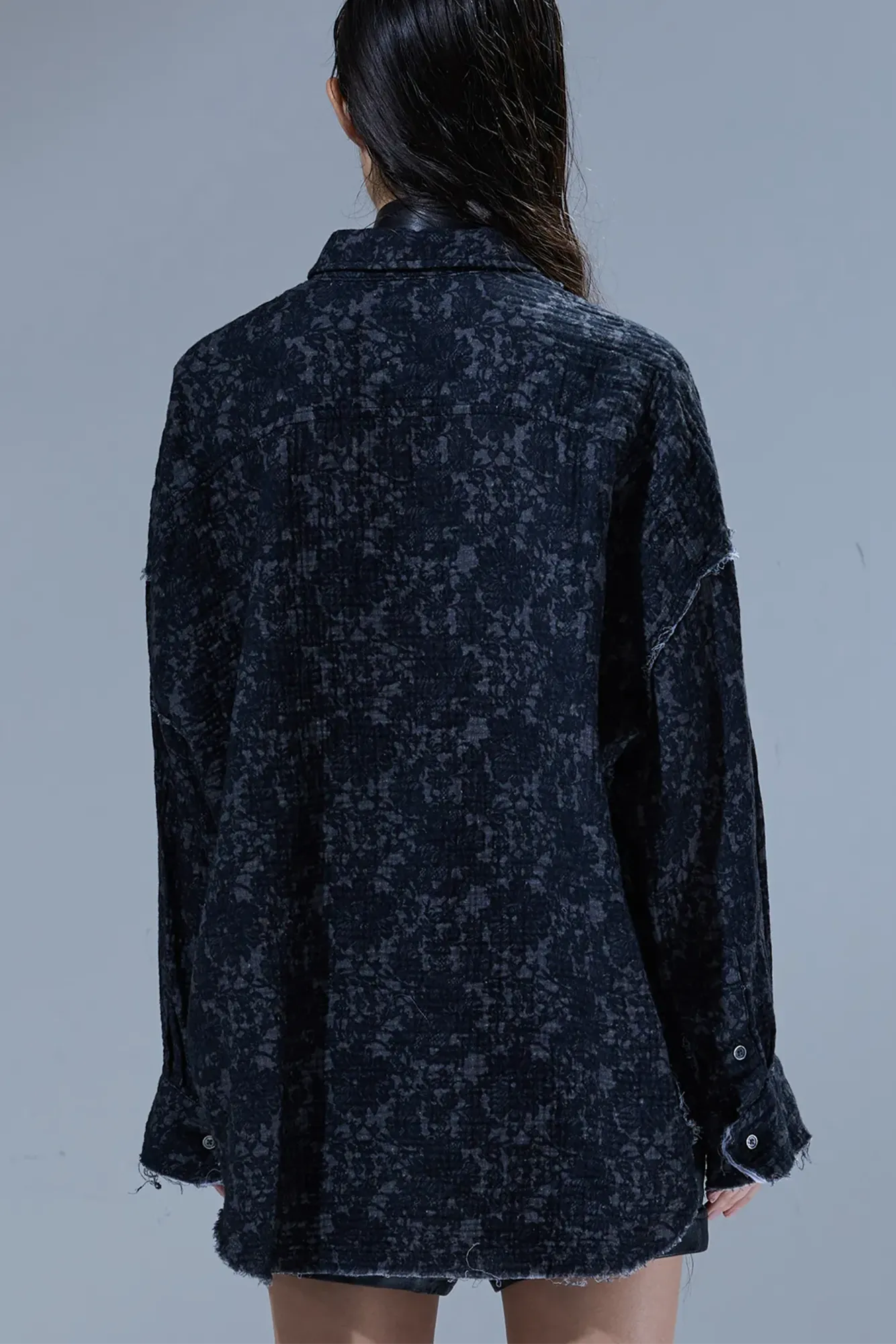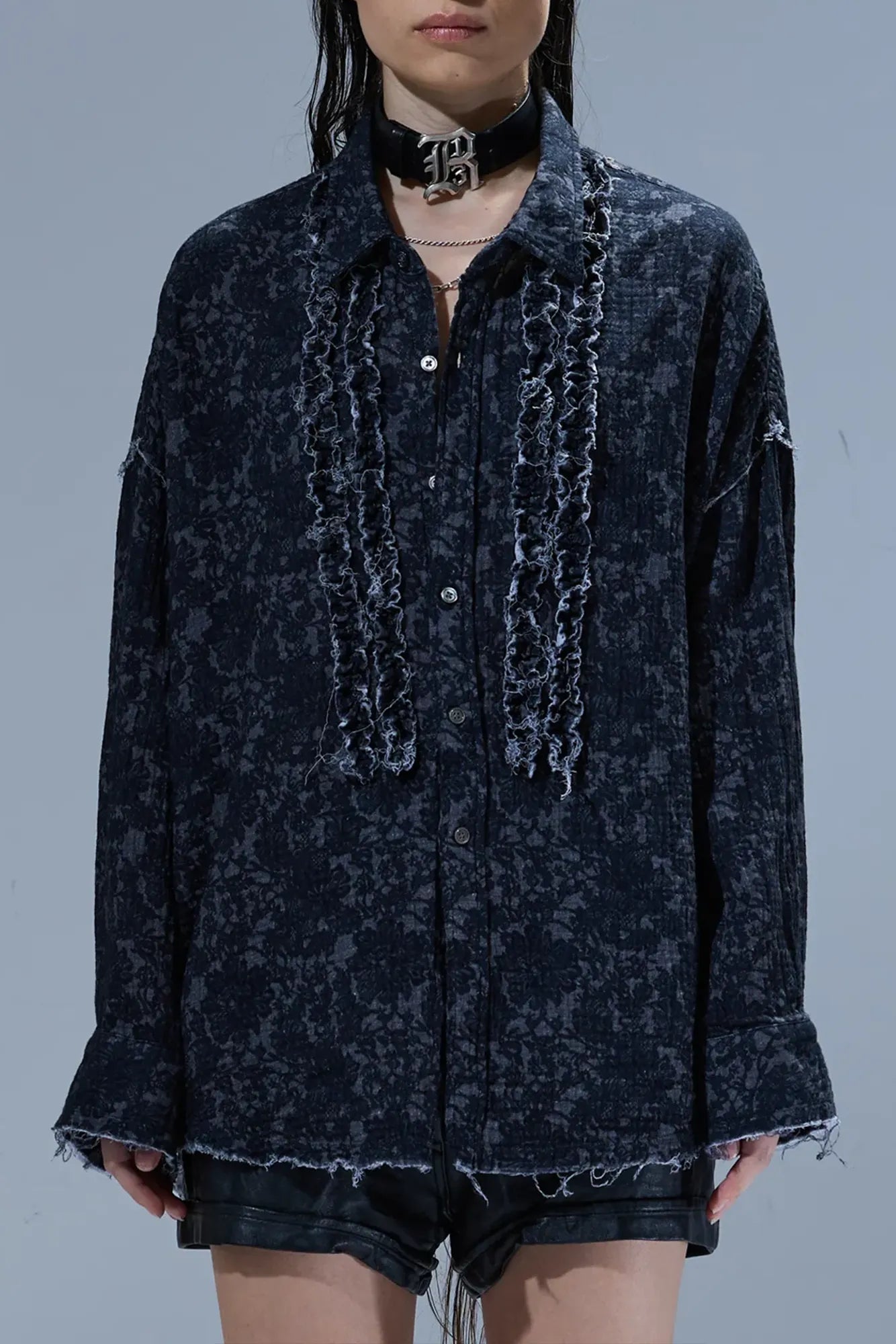 Locker geschnittenes BaumwollShirt in schwarzer Spitze mit ausgefransten Nähten. Rüschenbesatz entlang der Knopfleiste. Lange Ärmel, durchgehende Knopfleiste.