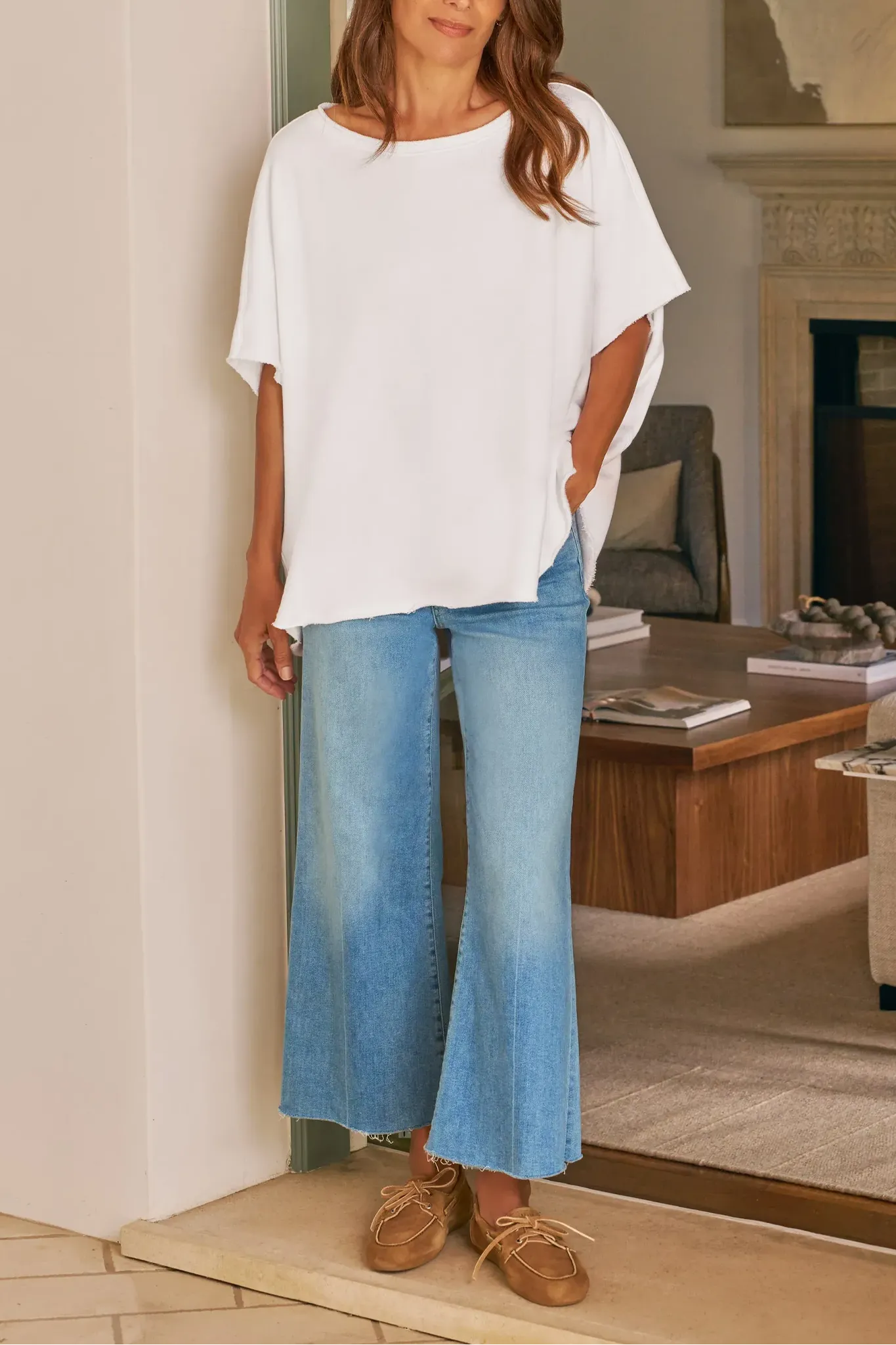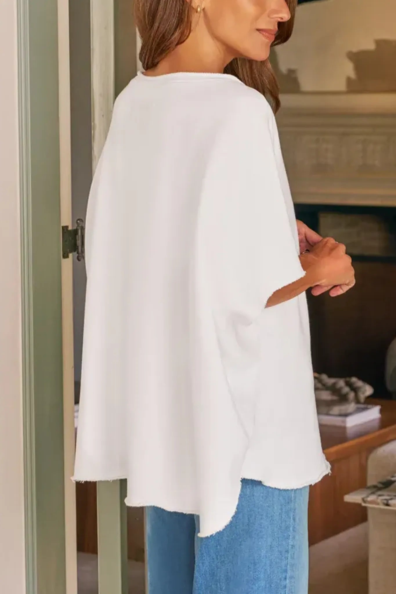 Locker geschnittenes Capelet aus Triple Fleece (dreifädiger Baumwoll-Fleece). Mit weitem Armausschnitt, gerolltem Rundhalsausschnitt und seitlichem Schlitz. Offene Kanten und Raw-Hem verleihen dem Piece einen modernen Look. Ideal zum Layern über Shirts, Hemden oder Kleider.