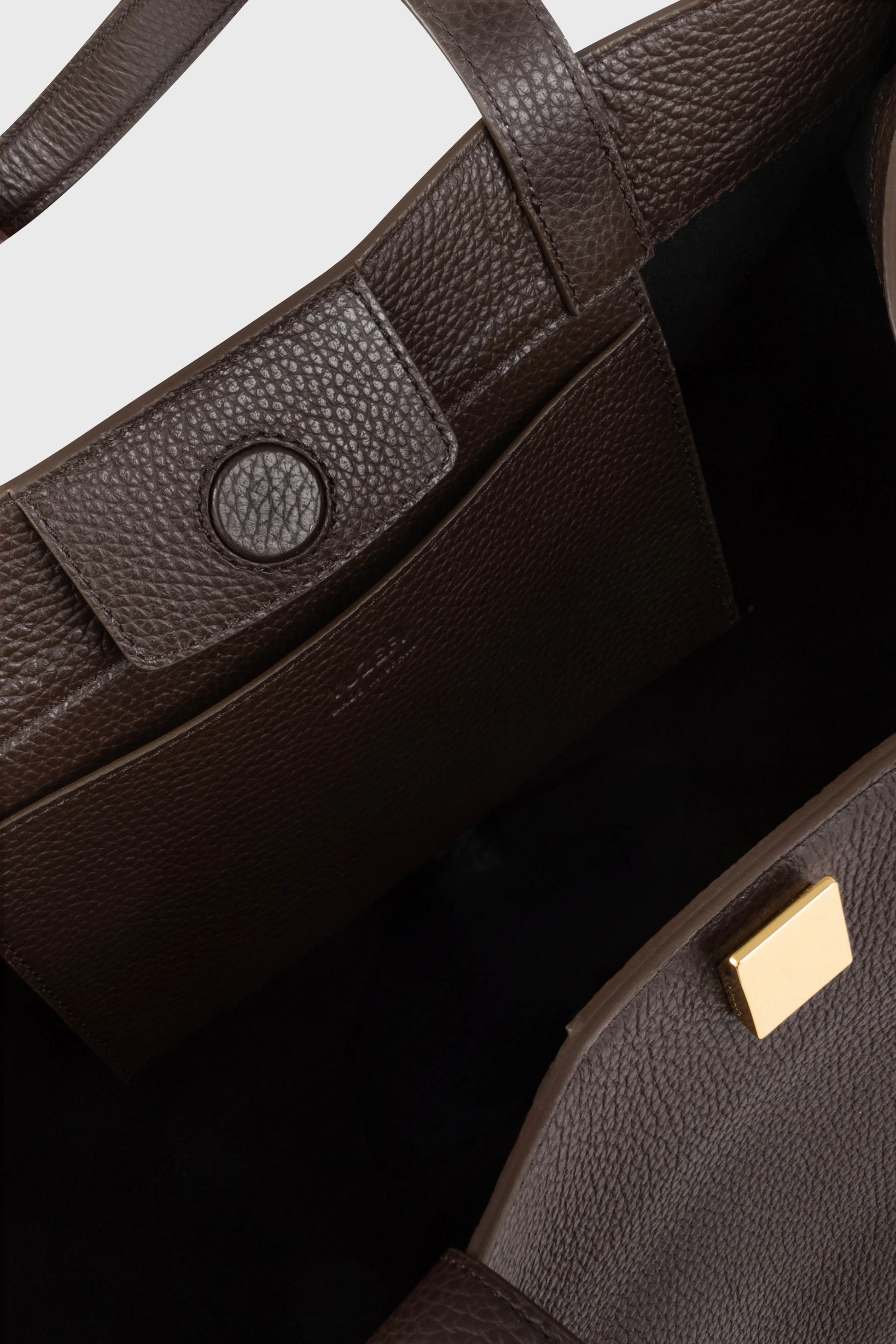 Geräumige Tote aus italienischem pebble-grained Leder in Espresso. Bietet Platz für einen 14'' Laptop und Essentials. Handgefertigt in Spanien.