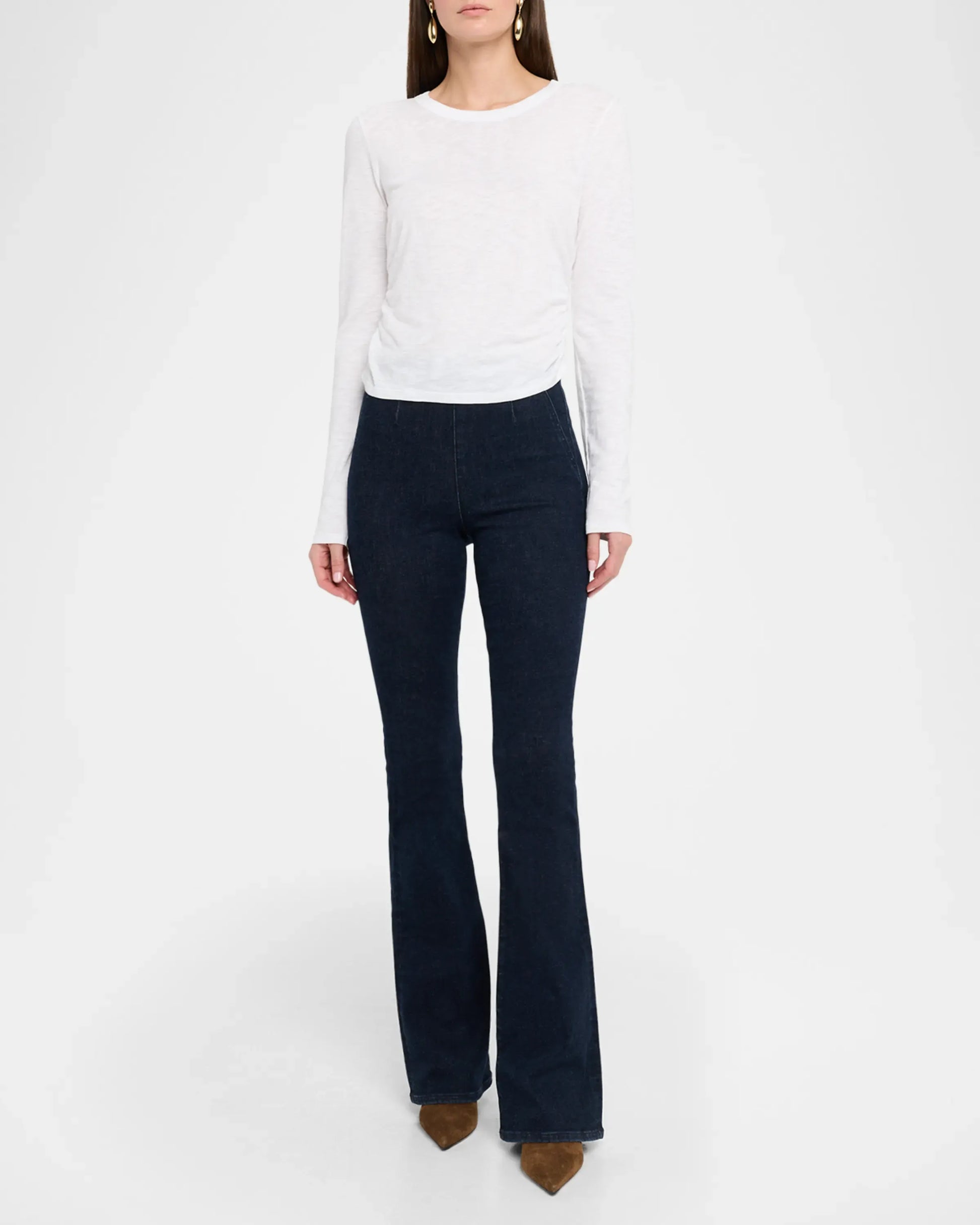 Langarmshirt aus weicher peruanischer Baumwolle mit seitlicher Raffung. Das Kisha Tee zeigt, wie schlicht und besonders ein Basic sein kann – mit feiner Struktur, weichem Griff und fließender Silhouette. Der leicht verkürzte Schnitt endet auf Hüfthöhe, ideal zu High-Waist-Hosen oder Jeans. Ein reduziertes Everyday-Piece mit femininer Linie und natürlicher Leichtigkeit.