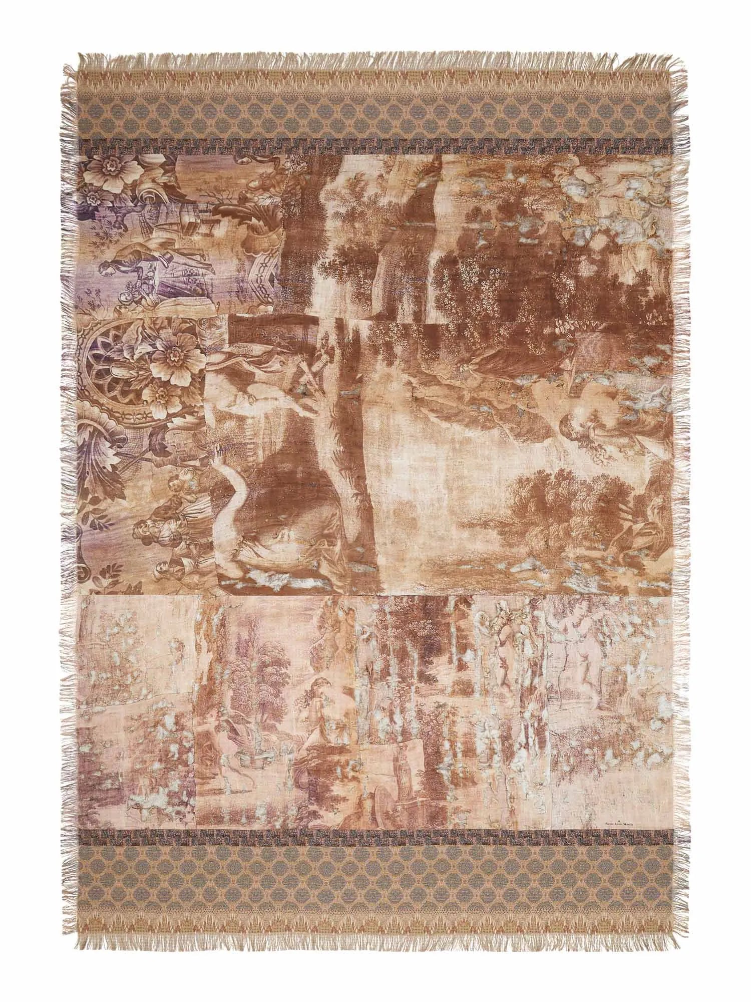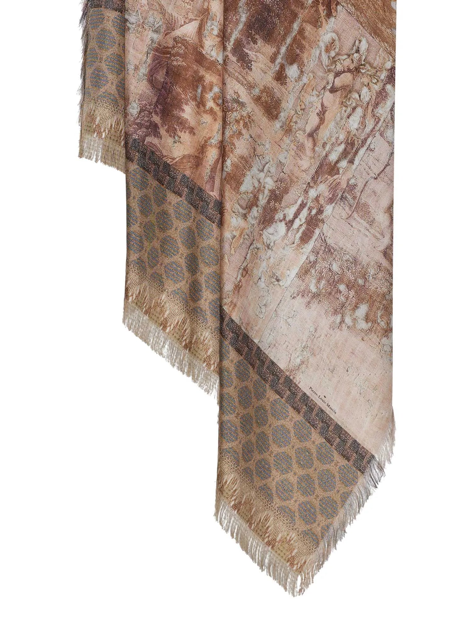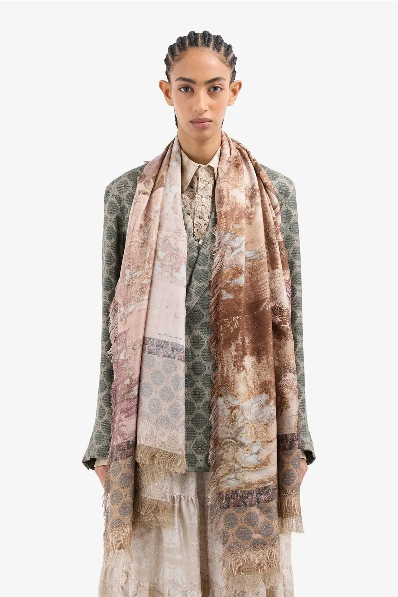 Großzügiges Seidentuch mit sanftem Fall. Historisch inspirierte Motive und eine warme Farbwelt in Rosa Antico verleihen dem Look Tiefe und Eleganz.